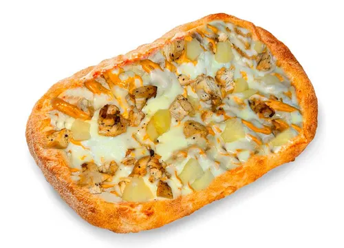 сыр моцарелла, ананасы и кусочки курицы на хрустящем тесте подарят вам удовольствие. Нарезается на 8 кусочков