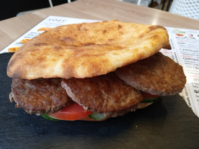 Большой пшеничный лаваш, три сочные котлеты из 100% говядины, много овощей на выбор: