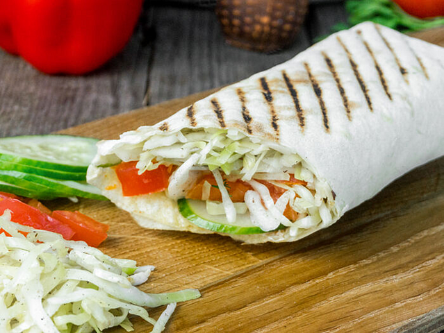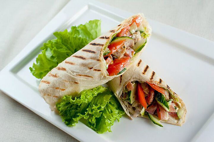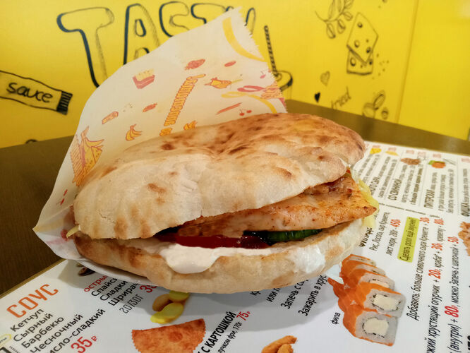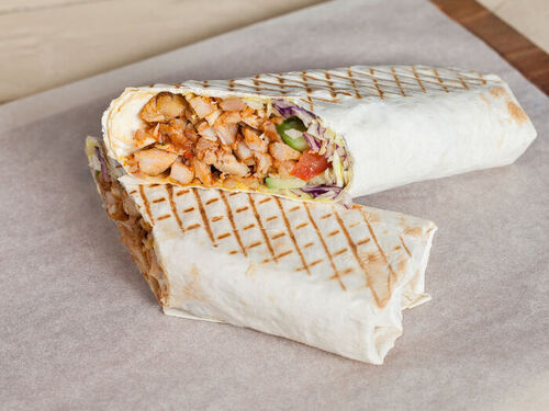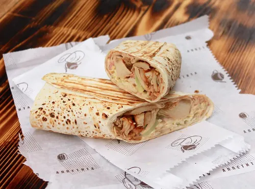 Большой пшеничный лаваш, увеличенная порция фирменной курицы гриль, много овощей на выбор: