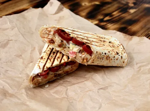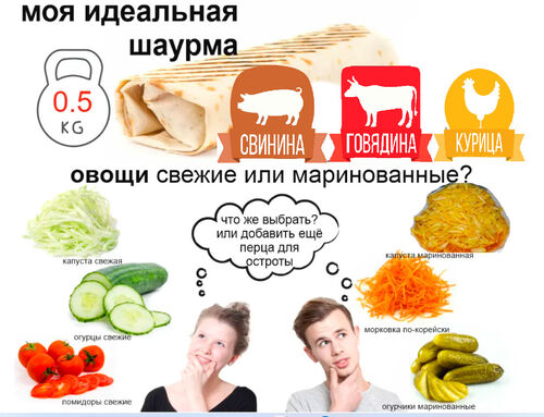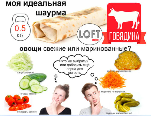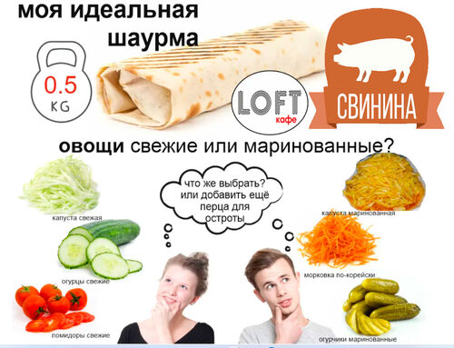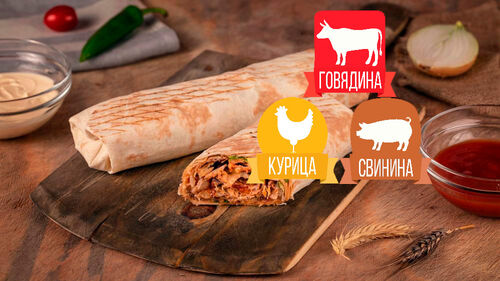 курица, свинина, котлета из говядины, свежие помидор и огурец, капуста на выбор, чесночный и томатный соус , пшеничный лаваш