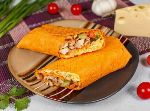 сырный лаваш, курица, помидоры и огурцы, сырный соус, капуста на выбор и чесночный сметано-майонезный соус