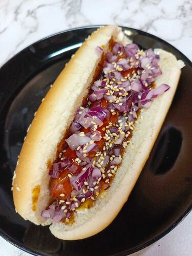 сосиска, соус терияки, майонез, сладкий хрустящий красный лук и кунжут