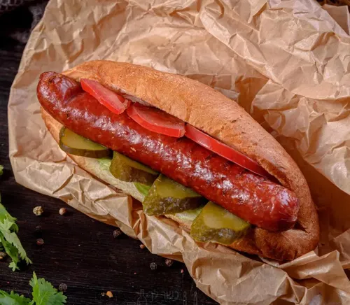 колбаска охотничья (свинина, курица), свежие томаты, огурчик маринованный и горчичный соус