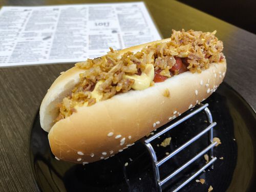 Сосиска из мяса птицы, жареный бекон, кетчуп, сладкий горчичный соус,жареный (карамельный) лучок